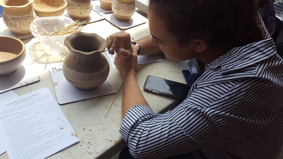 This week has been another pretty slow one since I didn't have any major traveling plans like I've had the past few weeks. My MMS meetings have been going good, I made plans with So-Ui to play badminton or ping pong during our next meeting and she also agreed to help me figure our my internet problem on my computer. Once again, my meetings with Sally went very well and this time we went to a little cafe that I think was called Zanzan. We also brought along Marie since they also have meetings together and this way she could do two in one. At the cafe, we got some cake, pancakes, and oreo milkshakes. Sally also agreed to help me with my computer and if So-Ui can't figure it out, she is going to bring me to a place in Wonju that might be able to help me. Even though I still have over a month left here, she also called my airlines and helped me to reserve the seat that I wanted so I wouldn't have to try and do it by myself. For our field trip this week, we went to a ceramics festival in Yeoju. A lot of people weren't too excited about this trip because we weren't exactly sure what to expect. When we got there, they had us go to one of the buildings and they had us make our own pottery...sort of. We thought that we were going to get to make our own ceramics, but it was mostly the masters doing it while we sat there and pretended to help. That was okay with me though, since I know if it was just me making it, it wouldn't have turned out very good. I ended up making a small bowl and I just have to wait about three weeks until they send it to me since they still have to glaze it. We also had the option of putting designs on what we made but I wanted mine to just be simple. While people were doing designs, I decided to move mine over to the table where all the ones that were finished were so mine wouldn't get damaged or smudged. Well, while I was setting it down, a woman approached me and started talking to me. This would have been fine, except that it was enough of a distraction that I ended up hitting my fingers on the side of my bowl, leaving two smudge marks. I didn't try to fix it because I didn't want to make it any worse. The lady that started talking to me was really nice though. Her name was Swin Yoon and she was an artist that had studied in France for a little while and is now working in Korea. After talking for a little bit, she said she had to get back to her stand, so I told her I would come check it out once I had a chance. Once everyone was done, we had some free time to check out the festival, so I went with Marisa and we walked around looking at all the stands (including Swin's). After our free time, we also had a tour of the Silleuksa Temple which was also there. It was a very nice place. They had lots of different colored lanterns hanging everywhere and they were also located right next to the Namhan river. Supposedly, this is the only riverside temple in Korea. After our tour was done, it was time for us to head back.